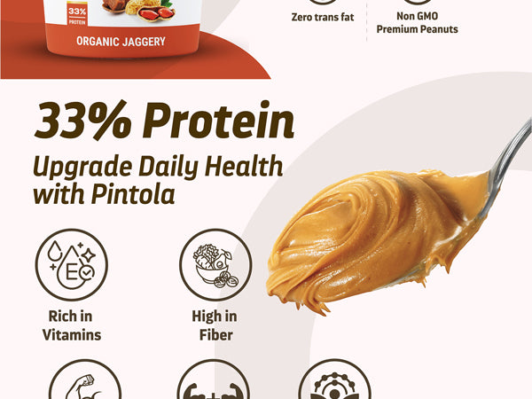 The goodness of organic jaggery added to the All-natural peanut paste and imported whey protein makes this product the best addition to a diet, one can ever ask for. High in protein and fibre, and ZERO in trans fat.