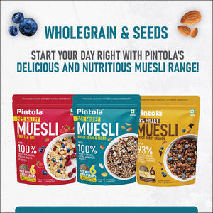 Introducing Pintola MUESLI which is a nourishing blend of 74% whole grains, 20% seeds, and nuts, and 6% dates, carefully crafted to provide a balanced and healthy breakfast option.