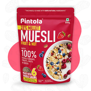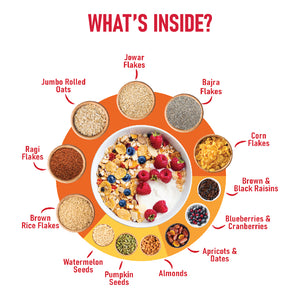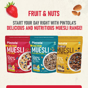 With 69% whole grains, Pintola Muesli Fruit and Nut is a wholesome blend of 6 whole grains which include jowar flakes, rolled oats, ragi flakes, brown rice flakes, bajra flakes, and corn flakes. These grains create a medley of textures, ensuring each spoonful is a delightful experience.