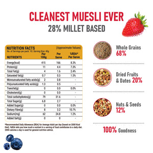 We've carefully selected a variety of fruit & seeds, which make up 20% of our muesli and are a combination of watermelon seeds, pumpkin seeds, blueberries, cranberries, and brown and black raisins, and relish their burst of flavours.